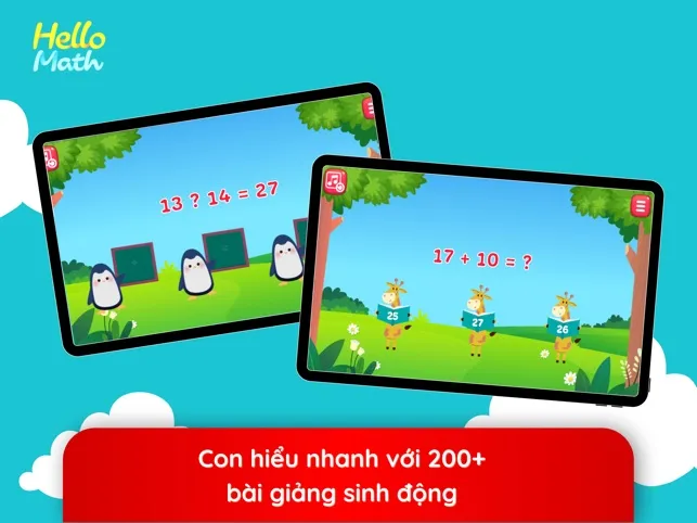 ** Hello Math được xây dựng chương trình học theo hệ thống và phương pháp toán tư duy Singapore, với lộ trình được sắp xếp khoa học và logic. Con có thể lựa chọn các chuyên đề học theo sở thích, tuy nhiên có những chuyên đề đòi hỏi sự xâu chuỗi kiến thức nên ba mẹ hãy động viên con học trình tự. Điều khác biệt mà Hello Math đem lại là mỗi chuyên đề là bên trong sẽ chứa các video hoạt hình thú vị, khi con xem xong câu chuyện con cần xem bài giảng lí thuyết sau đó làm bài luyện tập, vượt qua các bài luyện tập con sẽ được đến với những video tiếp theo, nên ba mẹ không phải lo lắng về việc con không hoàn thành hết bài tập nhé vì video hoạt hình rất hấp dẫn chắc chắn con sẽ quyết tâm tìm cách vượt qua thử thách.